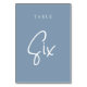 Einfache und schicke Tischnummer-Karten in Dusty Blue und Weiß machen eine elegante Aussage bei Ihrer Hochzeit oder Veranstaltung. Das Design bietet "table [number]" in einem spannenden Mix aus klassischen Serifen und handgeschriebenen Skripten. Design wiederholt sich auf beiden Seiten. Einzelne nummerierte Karten werden separat verkauft; bestellen Sie jede Tischnummer einzeln aus unserer Sammlung.