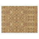 Bricks laid in parquet pattern is tiled. Bricks are in shades of yellow, orange, brown, and red.