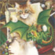 Eine orangefarbene Münzkatze und ein kleiner grüner Drache, der auf einem Tisch rollte, trauerten sich zusammen. Um sie herum sind Würfel, Schach, Runen Schwert und andere Spiele Vorräte.