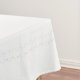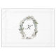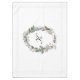 Dieses schlichte weiße Tischtuch mit einem Kranz aus immergrünen Zweigen, Blätter und Beeren mit einem Band, das Peace liest und einen Bereich im Zentrum des Kranzes hat, den Sie mit Ihrem Monogramm Initial personalisieren können. Auf allen vier Seiten ist eine abgestufte, weiße Trimmkante erkennbar.