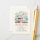 Taco-Dillet-Dillet-Verlosungskarte mit Darstellung eines Vintagen Pater-Trailer-Taco-Trailer mit Babykleidung, die an der Wäscheleine hängt und unter blauem Himmel mit Sonne und Wolken mit Birke verbunden ist. Im Text steht "Taco Bout A Baby!" Der Camper ist mit Ballongarten, Pampas, Kakteen, Papelpicado und Pflanze in Terrakottöpfen dekoriert.
