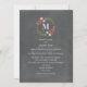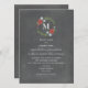 Eine Monografie-Hochzeitseinladung mit einer Darstellung von roten und blauen Blumen und Grünpflanzen in Kreis oben angeordnet. Personalisieren Sie sich mit Ihrem anfänglichen inneren Kreis. Personalisieren Sie den Text mit Einzelheiten Ihrer Veranstaltung. Die Aufnahmen stammen aus Braut und Bräutigam. Hintergrund ist Kalkboard inspiriert.
