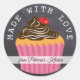 Mit Liebe aus der Küche von Aufklebern - ein niedlicher rosa Kuchen schmückt die personalisierten Küchenbackaufkleber mit einem rustikalen Chalkboard Hintergrund.