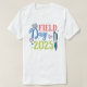 Dieses Design hat einen weißen T - Shirt mit dem Wort "FELD" in einem stilisierten roten Schriftart über dem Wort "Tag" in blau. Unter "Tag" ist das Jahr "2025" in grün. Das Design umfasst eine Grafik eines blauen Stifts und ein kleines Buch