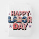 Dieses Design enthält die Phrase "Happy Labour Day" in fett gedruckten, Hauptstadt Buchstaben, mit einem patriotischen Thema, das die Farben und Muster der amerikanischen Flagge verwendet. Die Worte "Happy" und "Day" sind mit roten und weißen Streifen gestylt, während "Labour" und Sterne mit blauen und weißen Sternen gefüllt sind, wodurch ein festlicher und nationalistischer Look entsteht.