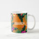 Eine helle, farbenfrohe Happy Mother's Day-Gestaltung mit tropischen Blume, Flamingos und tropischen Früchten auf orangefarbenem Hintergrund. Können Sie sich eine bessere Möglichkeit vorstellen, eine Tasse Kaffee oder Tee zu genießen? Fügen Sie der Tasse den Namen des Empfängers hinzu, um sie zum perfekten Muttertagsgeschenk zu machen.