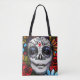 Lebhafter Blumentag des Toten Bildes auf einer schönen Tasche. Reiche, juwelenfarbene Blume umschließen das Gesicht einer Frau, das für den mexikanischen Tag der Toten gemalt wurde. Mut auf der drehend Seite. Anpassbar in der gewünschten Hintergrundfarbe. Nehmen Sie sich Zeit, um die Rose zu riechen, und vergessen Sie nie, eine ziemlich fabelhafte Tasche zu tragen...