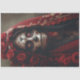 Ein atemberaubender Tag des Toten Designs mit einer Frau in einem lebendigen roten Kostüm, deren Gesicht kunstvoll wie ein traditioneller Zuckerschädel gemalt wurde. Ihre aufwändige Ansprache mit reichen rote Rosen ergänzt die Touch von Eleganz und Drama perfekt um die festliche und kulturelle Bedeutung der Feier zu ergänzen.