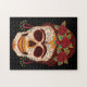 Nice Day of the Dead (Dia de Muertos) Design mit weiblichen Schädel mit Haar, Ohrringe, drei Rose auf dem Kopf und verschiedenen Elementen auf dem Gesicht