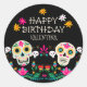 Tag der Toten Geburtstagsaufkleber, die Sie mit Ihrem Namen personalisieren können. Der Geburtstag ist glücklich, mit Knochen gezeichnet und das Design umfasst Blütenzucker Schädel, Schädel und Fiesta Blume. Bitte stöbern Sie in meiner Dia de los Muertos Kollektion für alternative Stile und passende Artikel.