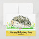 Eine Postkarte mit einem süßen Igel in einem gelben, mit schwarzer Tinte und Aquarellfarbe illustrierten Stück Wildblumen. Ideal für Postkartenbörsen!