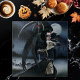 Frau mit einem Tag des toten Zuckerschädels auf ihrem Gesicht gemalt. Ein Rabe geht mit ihr auf der Schulter durch den Friedhof. Viele Symbole des Todes und der Wiedergeburt überall um sie herum.