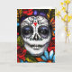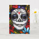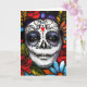Lebhafter Blumentag des Toten Bildes. Reiche, juwelenfarbene Blume umschließen das Gesicht einer Frau, das für den mexikanischen Tag der Toten gemalt wurde. Nehmen Sie sich Zeit, um die Rose zu riechen, und schicken Sie eine schöne Grußkarte..