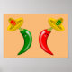 Dieses phantastische Poster bietet ein Paar Chilis, einen roten Chili und einen grünen Chili. Beide haben schwarze Augen und rosa Mund. Jeder Chili trägt einen Sombrero-Hut, der in seiner gegenteiligen Farbe zum Chili des mexikanischen Tages des Toten Festivals Dia De Los Muertos gekleidet ist. Der Sombrero enthält auch drei Blume mit abwechselnden roten und grünen Blütenblättern, die die Fahne Mexikos darstellen.