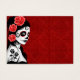 An diesem Tag der Toten inspirierte Design präsentiert sich eine wunderschöne Frau mit Zuckerschädelmustern auf ihrem Gesicht. Drei Rose tauchen in ihrem schwarzen Düsenhaar auf, zwei weitere Rose tätowieren auf ihrem Arm. Das Mädchen ist seitwärts stehend, mit dem Kopf leicht zum Betrachter gedreht. Ihre reine weiße Haut hebt sich besonders von den schwarzen Haaren und dem Kleid sowie dem leicht strukturierten, tiefen roten Hintergrund ab. Dieses einzigartige Design ist eine atemberaubende Darstellung dieses Tages der Toten.