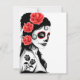 An diesem Tag der Toten inspirierte Design präsentiert sich eine wunderschöne Frau mit Zuckerschädelmustern auf ihrem Gesicht. Drei rote Rosen tauchen in ihrem schwarzen Düsenhaar auf, zwei weitere Rose tätowieren auf ihrem Arm. Das Mädchen ist seitwärts stehend, mit dem Kopf leicht zum Betrachter gedreht. Ihre reine weiße Haut hebt sich wirklich von den schwarzen Haaren ab und fügt sich perfekt in den hellen Hintergrund ein. Dieses einzigartige Design ist eine atemberaubende Darstellung dieses Tages der Toten.