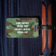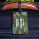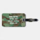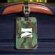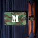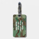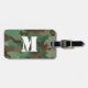 Personalisierte grüne Camouflage Gepäckanhänger haben ein fett weißes Monogramm Initial auf der Vorderseite und den Namen, die Adresse und die Telefonnummer auf der Rückseite. Das Tarnmuster ist reich an lebendigem Grün mit braunen und grauen Streifen.