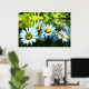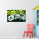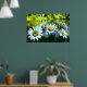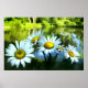 Es ist ein heller, sonniger Tag. Im Vordergrund stehen fünf wilde Dörfer mit fröhlichen gelben Zentren und weißen Blütenblättern. Ein schimmernder Teich, umgeben von grünen Sträuchern und Bäumen, ist in der Ferne. Jemand könnte einfach durchwandern und jedes Blatt abpflücken, während Sprichwort "er Liebe mich, er Lieben mich nicht".