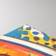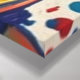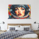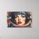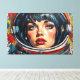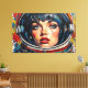 Otis Porritts digitales Kunstwerk zeigt eine auffallende Nahaufnahme des Gesichts einer Frau, gerahmt innerhalb des reflektierenden Visiers eines Astronautenhelms. Ihre intensiven blauen Augen, geschmückt mit langen Wimpern, und zarten Sommersprossen ziehen den Betrachter in ihren Bann, kontrastiert durch lebendige rote Lippen. Das Werk ist mit kühnen, ausdrucksstarken Pinselstrichen gestaltet, die eine reiche Impasto-Textur nachahmen und eine dynamische visuelle Oberfläche schaffen. Eine lebendige Palette aus tiefen Blautönen, hellen Gelbtönen und feurigen Rottönen dominiert, wobei ein spielerisches Tupfenmuster den Hintergrund belebt und die energetische und fesselnde Präsenz des Werks verstärkt.