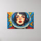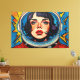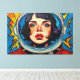 Otis Porritts digitales Kunstwerk zeigt eine auffallende Nahaufnahme des Gesichts einer Frau, gerahmt innerhalb des reflektierenden Visiers eines Astronautenhelms. Ihre intensiven blauen Augen, geschmückt mit langen Wimpern und zarten Sommersprossen, ziehen den Betrachter in ihren Bann, kontrastiert von lebendigen roten Lippen. Das Werk ist mit kühnen, ausdrucksstarken Pinselstrichen gestaltet, die eine reiche Impasto-Textur nachahmen und eine dynamische visuelle Oberfläche schaffen. Eine lebendige Palette aus tiefen Blautönen, hellen Gelbtönen und feurigen Rottönen dominiert, wobei ein spielerisches Tupfenmuster den Hintergrund belebt und die energetische und fesselnde Präsenz des Werks verstärkt.