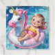 Ein niedliches junges Mädchen driftet sanft auf einem rosa-weißen Einhornfloat und gleitet über einen kristallklaren, blauen Pool.
