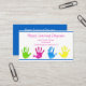 Eine helle, farbenfrohe Daycare Business Card mit kinderfreundlichen Händen auf weißem Hintergrund (vorne), Ihrem Firmennamen und Ihrem Namen und Telefonnummer. Reverse ist ein tiefblaues Spiel mit Adressen und Web-Kontaktinformationen. Zum Personalisieren fügen Sie einfach Ihren Text in unsere einfache Vorlage ein und ersetzen den Beispieltext.
