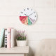 Diese Uhr verfügt über einen farblich gekennzeichneten Zeitplan für Ihr Kind, der die Nachmittags-/Abend-Aktivitäten von Hausaufgaben, Spielzeit, Abendessen, Badzeit und Nachtzeit beinhaltet. lila, pinke, gelbe und minzgrüne Farbe.