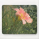 Pfirsichfarbene Taglilien in der Sommersonne vor einem grünen Hintergrund.