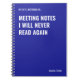 Funny Notebook für Büromitarbeiter, Manager, Arbeitsfreunde oder andere Verwaltungs- und Geschäftsleute. Personalisieren Sie den Namen, der am Ende des Covers "Meeting Notes I will Never Read Again" gedruckt werden soll. Individuelle Name Notizbücher eignen sich hervorragend für Jubiläen, Feiertage, Bürogeschenke und vieles mehr!