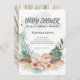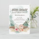 Die Babydusche-Einladung der Tropeninsel inspiriert Paare umfasst eine Anordnung von Hibiskus, Flamingo- und Jasmin-Blume, botanischer Vegetation und Palmen-Blätter mit Aquablau-Aquarell-WaschHintergrund. Auf der Rückseite befindet sich ein abstraktes Palmenblatt, das in Beige- und Tauptönen von Chaki gehalten ist. Ideal für Strand, Tii, Luau und tropische Themen.
