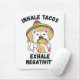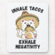 Niedliches Design, das eine hübsche Cartoon-Katze mit einem Sombrero-Hut und einem mexikanischen Tako mit dem lustigen Zitat "Inhale tacos, exhale Negativität. Leckeres Essen macht dich glücklich.