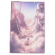 Ein einsamer Heißluftballon schwimmt durch den hellrosa Canyon zwischen hohen Wolken. Die Sonne, tief im pastellfarbenen Himmel, leuchtet hinter dem Rand der Billows und sendet Lichtströme zum Betrachter.