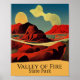 Dieses Plakat bietet einen atemberaubenden Blick auf das Tal des Fire Staat Park in Nevada. Der Park ist bekannt für seine anderen Gesteinsformationen, die durch Millionen von Jahren Wind- und Wassererosion entstanden sind. Das Plakat zeigt eine nahe Aufführung einer besonders eindrucksvollen Felsformation, die als Feuerwelle bekannt ist. Die Feuerwelle ist eine Reihe von gewellten, orangefarbenen Sandsteinschichten, die übereinander gestapelt werden. Die Farben der Feuerwelle sind so lebendig, dass sie fast zu leuchten scheinen. Das Poster bietet auch eine Wüstenlandschaft im Hintergrund mit Kakteen, Joshua-Bäumen und anderen Wüsten-Pflanze. Das Plakat ist in einem minimalistischen Stil des Reiseplakats gestaltet.