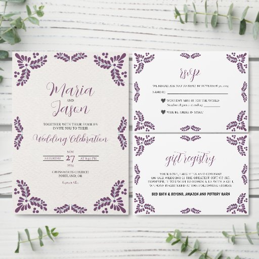 This Talavera Purple Floral Minimalist Spanish Wedding Invitation design features a minimalist approach with delicate, symmetrical purple floral motifs placed in each corner and along the edges. The small, leaf-like shapes create a sense of movement while maintaining an airy, open space in the center, allowing for ample text placement. The simplicity and elegance of the pattern evoke traditional Talavera tiles, giving the design a classic Mexican artisanal feel.