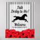 Derby Party Begrüßungsschild Poster bietet eine Racehorse Silhouette, schwarz-weiß Streifen und rote Rosen, Talk Derby to Me mit Ihren Party-Details in schicken Schriften. PASSENDE Artikel in unserer Sammlung.