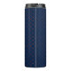 Tall blue travel mug with a black lid, featuring an orange geometric pattern of intersecting lines and dots. The design is modern and sleek.
