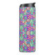 Tall travel mug with a vibrant, symmetrical floral pattern in bright pink, blue, and green hues. The design exudes a lively, playful feel.