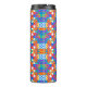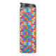 Tall travel mug with a vivid geometric pattern. The design features colorful shapes and abstract flowers in bright orange, blue, pink, and green tones.