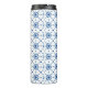 Tall, white travel mug with a black lid, adorned with a blue intricate floral and geometric pattern, conveying a classic, elegant style.