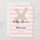 Genießen Sie das Kinderzimmer Rhymes Quiz Babyduschenspiel auf sanften, rosa und weißen Streifen Hintergrund. Niedliches, bräunliches, sonniges Kaninchen hinten mit Vorlagen, die für Sie geschaffen wurden.