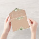 Alles in einer Hochzeitseinladung mit botanischer Vegetation, rustikalen Blätter und eleganter Typografie auf bräunlichem Hintergrund. Die Einladung enthält eine perforierte RSVP-Karte mit QR-Code. Entwickelt von Thisisnotme©