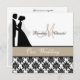 Schwarz-Weiß-Damast-Druck mit einer Bräunungsband, eine Silhouette Braut und Bräutigam, und Bereiche, die Sie mit Ihren Namen, Monogramm-Ersteingabe, Hochzeitsfeier und Empfang Informationen über eine maßgeschneiderte Hochzeitseinladung, die klassisch und traditionell in einem!