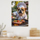 Dieses wunderbare Bild zeigt einen bräunlichen und weißen französischen Bulldog, der einen knusprigen Hut und eine Schürze des weißen Koch trägt, der ein Stück Fleisch vorsichtig auf einem Gartengitter grillt. Mit fokussierten Augen und einem Spatel in Pfoten, neigt die bezaubernde Kanine fachmännisch zu dem schwindelnden Steak, mit kleinen Tomaten und Kräutern garniert. Die belebte Umgebung im Freien mit warmen Sonnenstrahlen vervollständigt diese bezaubernde kulinarische Szene.