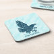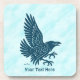 Ein schlichtes, blaues Silhouette-Bild eines lebhaften Raven (Corvus corax) im nordisch-keltischen Stil, überlagert auf einem verschneiten Hintergrund. Passen Sie Ihren eigenen Text an.