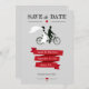 Trendy Speichern Sie die Date-Karten mit einer Braut und Bräutigam auf einem Tandem-Fahrrad. Vintages Design mit rotem Banner auf grauem Hintergrund. Auch in anderen Farben erhältlich. Entnehmen Sie den entsprechenden Save the Date-Briefmarke unten: