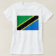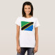 Die Vorderseite dieses T - Shirt zeigt mutig die tansanische Fahne mit ihrer markanten gelben schwarzen Diagonale mit grünen und blauen Dreiecken auf beiden Seiten. Hinter dem Bild befindet sich eine attraktive Karte von Tansania.