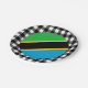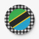 Teller: Rustikale Tansania Party Teller mit tansanischen Fahnen umgeben von schwarz-weißem Büffel karierte Muster - Liebe mein Land, festliche Dekoration, nationale Patrioten / Sportfans