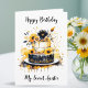 Eine Geburtstagskarte für eine Tante, die personalisiert werden kann, mit einem hübschen Geburtstagskuchen mit schwarz-weißem Zuckerguss und gelben Sonnenblumen.