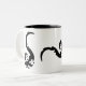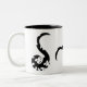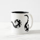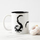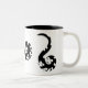 Diese Tasse verfügt über drei lebendige, spielerisch schwarze Tanzdrachen Set auf einem silbermetalischen Hintergrund mit schwarzem Trimm.