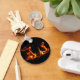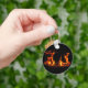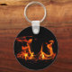 Dieser Schlüsselanhänger zeigt die Feuerenergie in einem Holzofen. Die Flammen in Orange, Gold und Gelb erscheinen als fröhliche Tanzfiguren. Sie sind von einem schwarzen Hintergrund abgeschnitten.